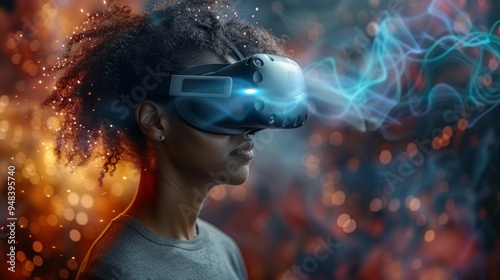 A person engages in virtual reality exploration while adorned with a VR headset, surrounded by vibrant digital effects
