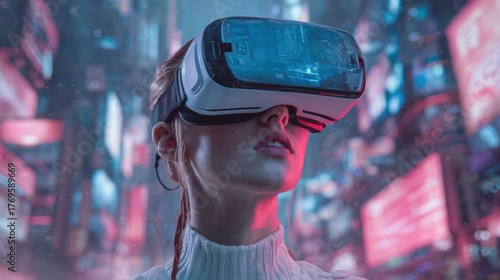 A person experiences an immersive virtual reality adventure in a vibrant neon city.