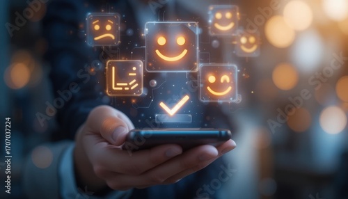A person holding a smartphone with glowing feedback icons floating above, including sad, neutral, and happy faces, with a checkmark highlighting the smiling face,
