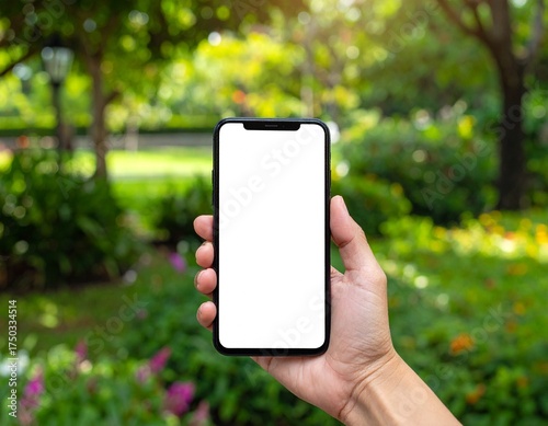 A person holds a smartphone with a blank screen in a lush green garden, perfect for showcasing apps or content