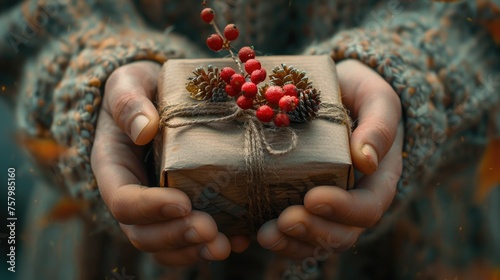 A person holds a wrapped present in their hands, ready to give or receive a gift.