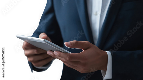 A person in a suit holding a tablet device with dark background in a close up shot of the hands and device on transparent background