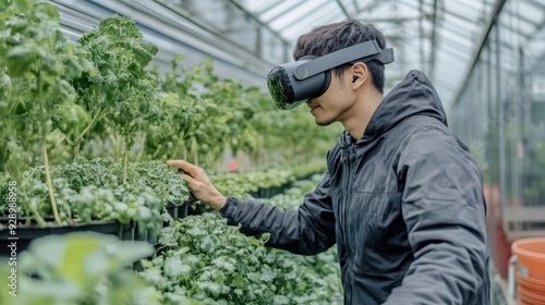 A person in a virtual reality headset carefully inspects plants inside a well-lit greenhouse
