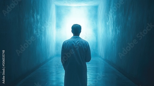man, person, white, robe, dark, room, mysterious, alone, isolated, eerie, atmospheric, setting, dim, lighting, low, dramatic, mood