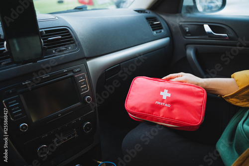 A person is currently seated inside a vehicle, actively holding and managing a first aid kit, essential for incase emergencies while on the road in this automotive setting