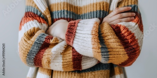 A person is wearing a striped sweater and has their arms crossed. The person's body language suggests that they are feeling defensive or closed off