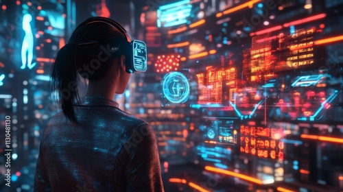 person, navigating, digital, landscape, futuristic, city, in, virtual, reality, interact, holographic, signs, structure, the, environment, vibrant, detailed, photorealistic, smooth