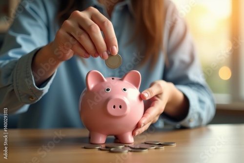 A person putting coins into a piggy bank, representing the concept of saving money for the future, financial responsibility, and wealth management, warm lighting,