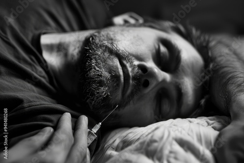 man, sleep, bed, rest, relaxation, bedchamber, horizontal, lying, down, eye, mask, night, time, quiet, calm, peaceful, solitude, alone, single, individual, personal, space