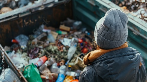 A person searching through a dumpster for food, conveying the harsh reality of food insecurity and the need for sustainable solutions.