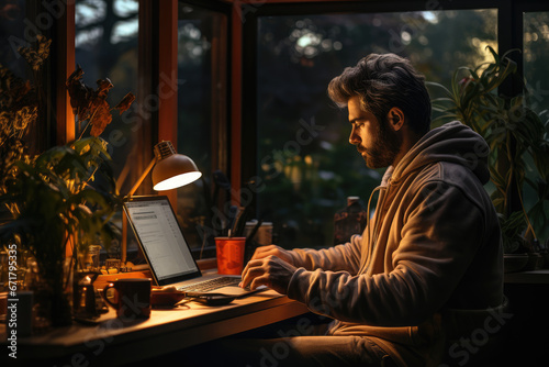 A person sipping coffee in a cozy home office, promoting work-life balance and remote work opportunities. Generative Ai.