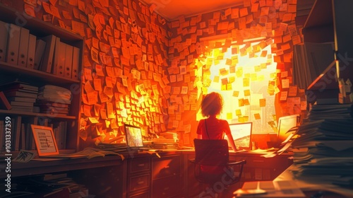 A person sits at their desk, surrounded by notes and paperwork. The window behind them is filled with sticky notes. AI.