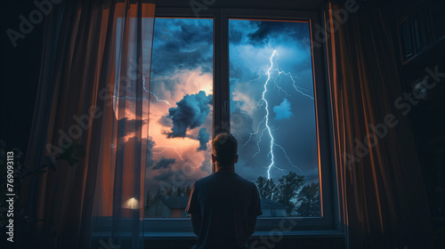 man, standing, window, watching, lightning, illuminate, night sky, thunderstorm, stormy, weather, observation, thunder, flash, bolt, night time, spectacle, nature, beauty, impressive, fascinating, atmospheric, admiring, gazing, fascination, captivating, mesmerizing, lightning strike