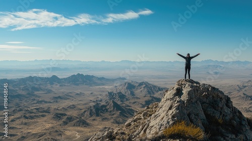 person, standing, arm, wide, open, mountain, looking, huge, landscape, sky, nature, mountain, top, rock, peak, woman, freedom, hill, outdoors, travel, hiking, view, high, summit, adventure, desert, climbing, panorama, people, success, victory