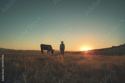 A person stands beside a cow in an open field, surrounded by nature