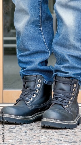 A person stands confidently, showcasing black lace-up boots while dressed in denim jeans on a stone pathway, with a modern glass building in the background