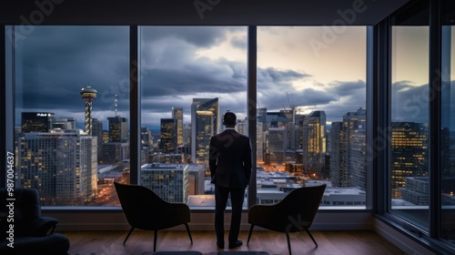 A person stands in a modern room with floor-to-ceiling windows, gazing out at a city skyline under a cloudy sky, creating a reflective mood.