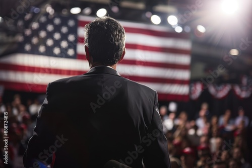 speech, public, address, crowd, flag, america, event, stage, lighting, back, view, suit, patriotism, us, audience, politic, campaign, assembly, celebration, rally, speaker, dais, leader, people, gathering, meeting, national, presentation, communication, spotlight