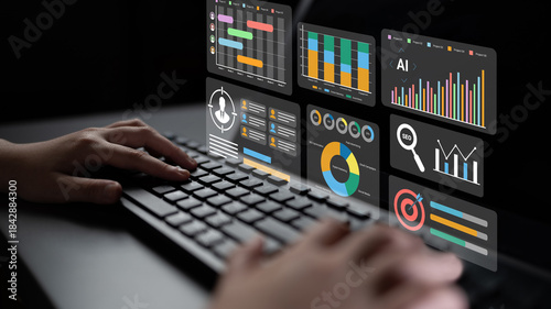 A person typing on a keyboard in a modern workspace, surrounded by vibrant data visualizations and analytics dashboards displayed on a transparent screen for enhanced productivity. Gantry