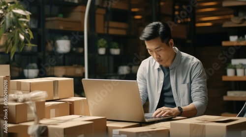 man, laptop, office, workspace, computer, box, plant, desk, technology, warehouse, cardboard box, shipping, commerce, business, productivity, urban, entrepreneur, employee, corporate, contemporary, city landscape, digital