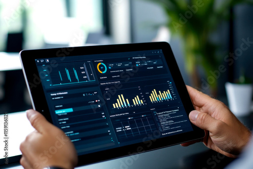 A person uses a tablet displaying vibrant data visualizations and analytics in a modern office setting.