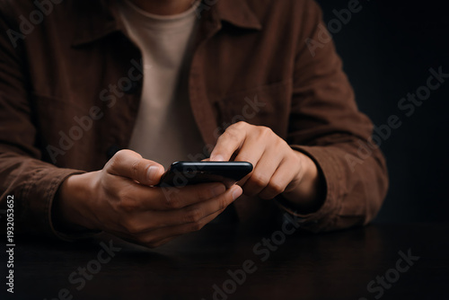 A person using a smartphone on a dark table, close-up view of hands holding device