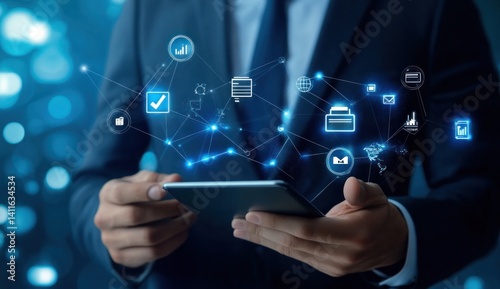 business, technology, networking, digital, datum, connection, communication, interface, future, abstract, concept, information, cloud, online, system, global, modern, innovation, analysis, management, process, diagram, progress, cyberspace, software, application, mobile, tablet, screen, hand, suit, blue, light, bright, glowing, icon, visualisation, representation, development, automation, interaction, access, chart, document, electronic mail, earth, server, network