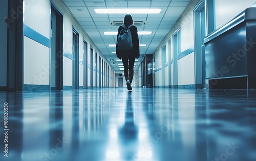 A person walking down an empty hallway, with the only sound being their footsteps echoing, emphasizing the feeling of being alone.