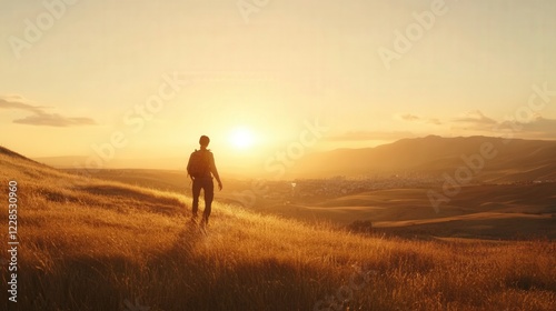 A person walking through golden grass at sunset, overlooking a serene valley with distant hills