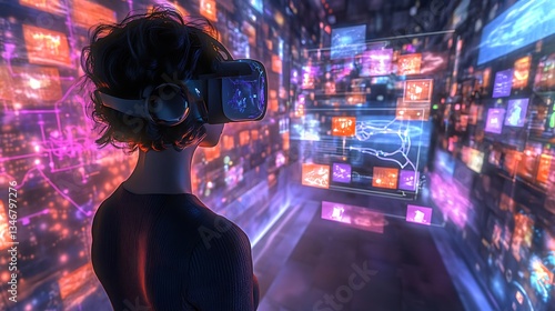 A person wearing a VR headset and headphones stands in a futuristic office space, surrounded by glowing screens displaying abstract patterns
