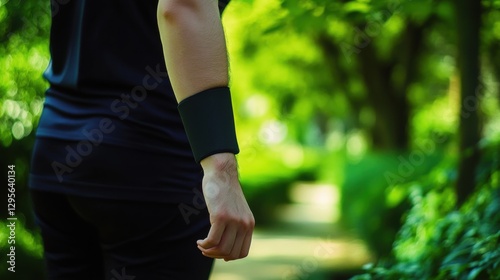 A person wearing an elbow support during a light walk in a park. Featuring protection and movement