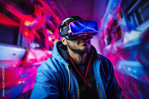 A person wearing virtual reality glasses, exploring metaverse world of digital art