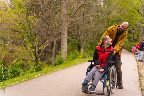A person with a disability in the wheelchair being pushed by a friend in a public city park, strolling along a path having fun in spring