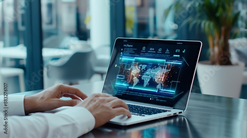 A person working on a sleek laptop with a futuristic holographic interface in a modern office setting, copy space for text, focus cover all object, deep depth of field,