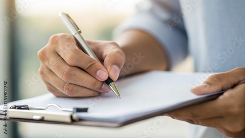 A person writes on a clipboard with a pen, highlighting a moment of note-taking or documentation in a professional setting.
