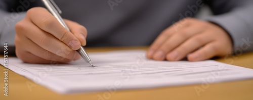 A person writing on a document with a pen on a wooden table.