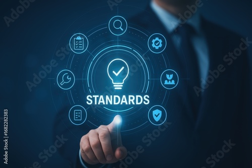 A person's finger touches a holographic projection displaying the word STANDARDS surrounded by various symbols for quality control, highlighting the concept of quality assurance.
