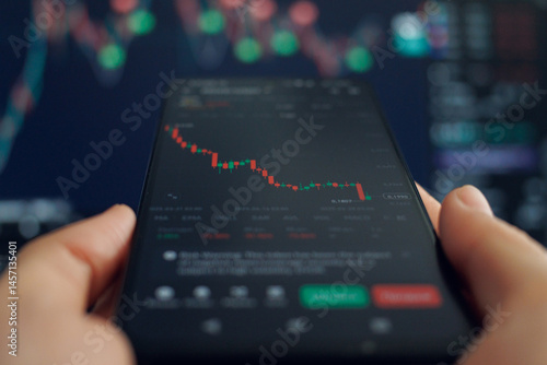 A person's hands hold a smartphone displaying a declining stock market chart with predominantly red candles, indicating a downward trend,