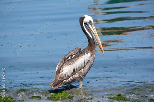 A Peruvian Pelican stands in the water