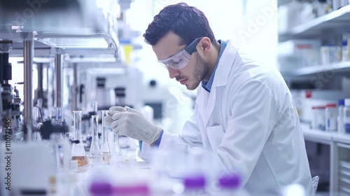 A pharmaceutical scientist in a lab coat working on drug formulation in a pharmaceutical laboratory