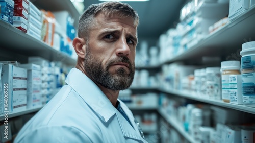 A pharmacist stands confidently surrounded by shelves full of medicine bottles, embodying focus and professionalism in a well-stocked pharmacy's secure environment.