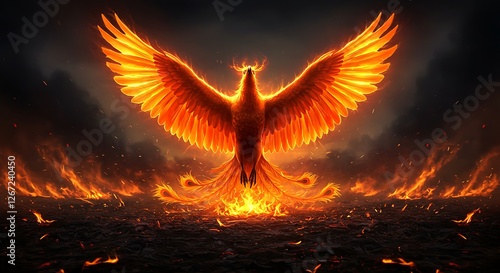 A phoenix rising from its ashes, its wings glowing with fiery renewal.