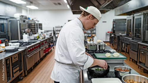 A photo of a chef cooking in a kitchen. The chef is wearing a white chef's coat and a hat. He is cooking in a large, commercial kitchen with stainless steel appliances and a tiled floor.