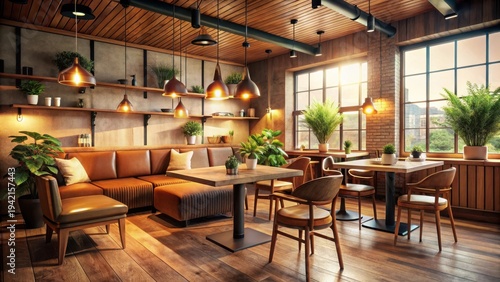 A photo of a cozy cafe interior with wooden furniture and soft lighting Warm tones, comfortable seating, and subtle decor create a peaceful atmospher