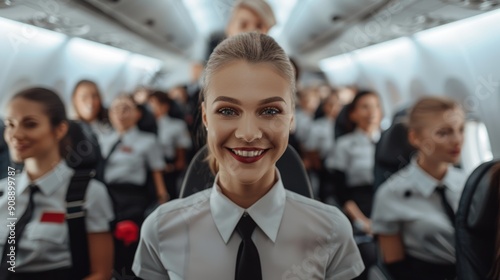 A photo of a diverse group of flight attendants posing and smiling in the aisle of an airplane, with passengers sitting behind them.