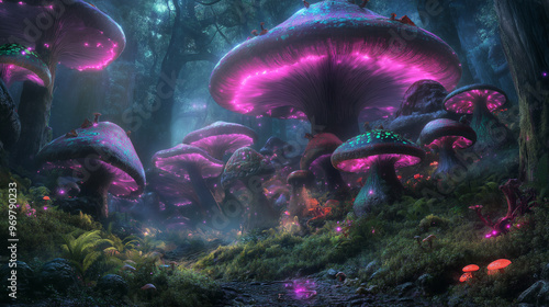 A photo of a forest of giant mushrooms with various sizes and colors. The forest floor is covered with soft moss and tiny glowing plants