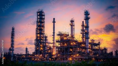 A Photo of a Large Industrial Complex at Sunset, Capturing the Tall Towers and Interconnected Pipes of the Refinery, Set Against a Backdrop of Colorful Clouds.