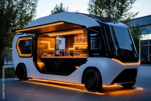 A photo of a white and black vehicle with its lights on showcasing its unique colors and illuminated features Futuristic food truck with interactive ordering system.