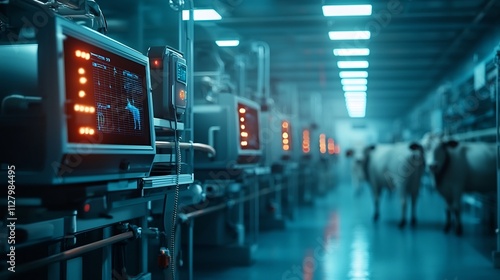 futuristic, dairy, farm, robotic, milking, system, cow, smart, collar, advanced, monitoring, network, visualisation, glowing, line, copy, space, technology, automation, agriculture, precision, datum, sensor, cyberspace, of, thing, sustainable, innovation, future, concept, industry, efficiency, modernization, optimization, digital, transformation, farming, management, connectivity, machine, learning, sustainability, design