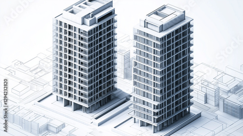 A photorealistic 3D architectural model of two high-rise buildings in an isometric perspective, displaying intricate facade designs and concrete structures in varying shades of gray